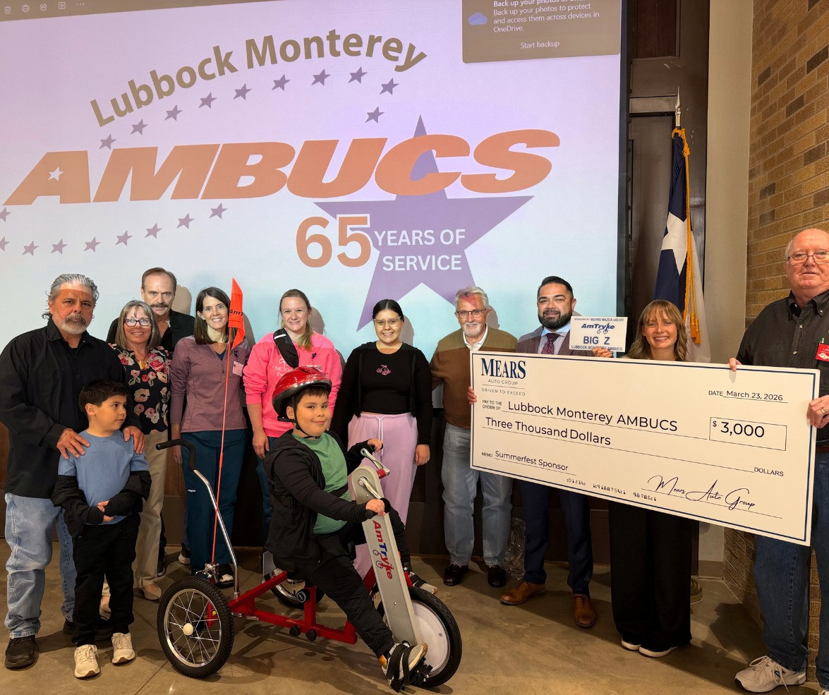 Big Z received his Amtryke on behalf of a very generous donation from Mears Mazda of Lubbock. As you can see it takes many people for an Amtryke recipient to receive their much-needed therapeutic tryke. To become involved in the Lubbock Monterey AMBUCS, you can DONATE now or become a SPONSOR. Come join us at our luncheon meetings and see what we're all about. We are the Lubbock Monterey Chapter of AMBUCS; Proud of our past...Engaged in our present...and, excited about our future. As it was in 1960...and as it still is today...WE STAND SHOULDERS TOGETHER